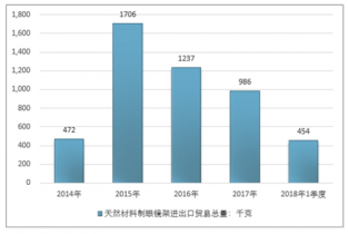 2016年我國天然材料制眼鏡架進出口貿易總量1237千克 ,2017年進出口貿易總量986千克 ;2018年1季度進出口貿易總量454千克 。