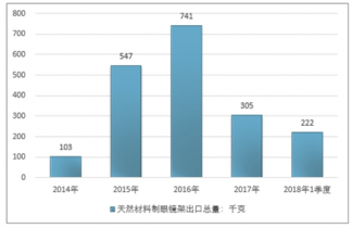 2016年我國天然材料制眼鏡架出口總量741千克 ,2017年出口總量305千克 ;2018年1季度出口總量222千克 。