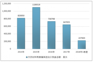 2016年我國天然材料制眼鏡架進出口貿易總額730798美元,2017年進出口貿易總額647655美元;2018年1季度進出口貿易總額227603美元。