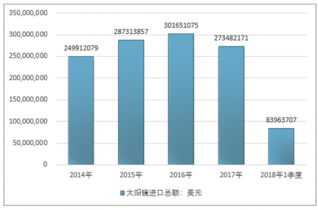 2016年我國太陽鏡進口總額301651075美元,2017年進口總額273482171美元;2018年1季度進口總額83963707美元。