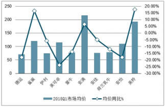 2018Q1線上B2C成人奶粉市場TOP10品牌市場均價及增長情況