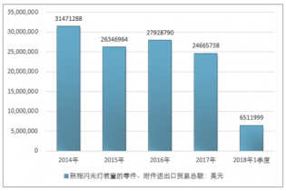 2016年我國(guó)照相閃光燈裝置的零件、附件進(jìn)出口貿(mào)易總額27928790美元,2017年進(jìn)出口貿(mào)易總額24665738美元;2018年1季度進(jìn)出口貿(mào)易總額6511999美元。
