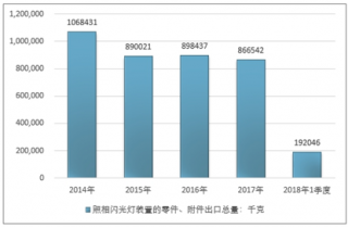 2016年我國(guó)照相閃光燈裝置的零件、附件出口總量898437千克 ,2017年出口總量866542千克 ;2018年1季度出口總量192046千克 。