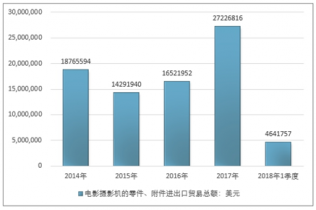 2016年我國(guó)電影攝影機(jī)的零件、附件進(jìn)出口貿(mào)易總額16521952美元,2017年進(jìn)出口貿(mào)易總額27226816美元;2018年1季度進(jìn)出口貿(mào)易總額4641757美元。