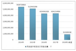2016年我國(guó)液晶顯示板進(jìn)出口貿(mào)易總量4324361028個(gè) ,2017年進(jìn)出口貿(mào)易總量4341214904個(gè) ;2018年1季度進(jìn)出口貿(mào)易總量913209158個(gè) 。