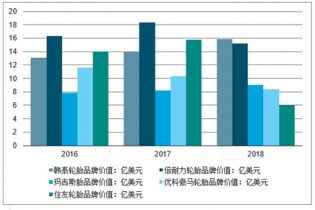 2016-2018全球前10輪胎品牌價值趨勢-TOP5(單位:億美元)
