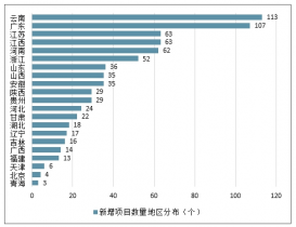 2019年第三季度的新增項目數(shù)量涉及21省市,761個項目。排名前三位是云南省、廣東省、江蘇省,分別為113個、107個、63個。