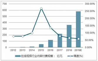 2012-2019年中國在線視頻行業(yè)內(nèi)容付費(fèi)規(guī)模統(tǒng)計(jì)及增長(zhǎng)情況預(yù)測(cè)