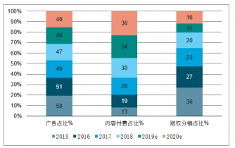 2015-2020年中國(guó)在線視頻行業(yè)細(xì)分業(yè)務(wù)占比情況