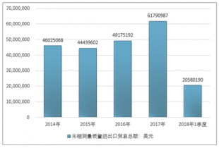 2016年我國光柵測量裝置進出口貿易總額49175192美元,2017年進出口貿易總額61790987美元;2018年1季度進出口貿易總額20580190美元。