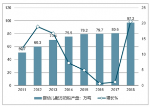 2011-2018年中國嬰幼兒配方奶粉產量及增速情況