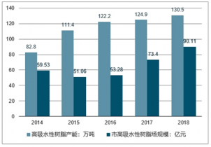2014-2018年我國高吸水性樹脂產能及行業市場規模走勢