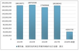 2016年我國(guó)管樂(lè)器,但游藝場(chǎng)風(fēng)琴及手搖風(fēng)琴除外出口總額175609668美元,2017年出口總額185286342美元;2018年1季度出口總額42031729美元。