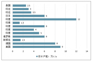 國外二硫化碳的生產主要分布在美國、巴西、阿根廷、印尼、印度、泰國、中國臺灣、澳大利亞、韓國、日本、越南、秘魯等國家和地區。二硫化碳設計產能67.8萬t/a,用戶主要集中在粘膠、選礦藥劑及垃圾發電等行業。