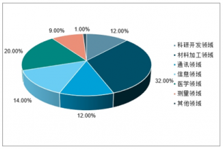 目前我國(guó)激光產(chǎn)業(yè)主要應(yīng)用于激光加工、醫(yī)療等行業(yè),其中科研開發(fā)領(lǐng)域占12%,材料加工領(lǐng)域占32%,通訊領(lǐng)域占12%,信息領(lǐng)域占14%,醫(yī)學(xué)領(lǐng)域占20%,測(cè)量與其他領(lǐng)域各占9%和1%。