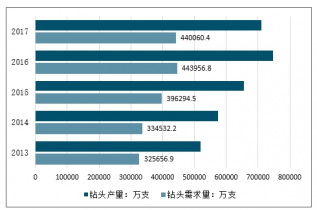 2016年我國鉆頭需求量為443956.8萬支,2017年我國鉆頭需求量為440060.4萬支。2016年我國鉆頭產量為745955.0萬支,2017年我國鉆頭產量為711135.1萬。