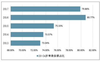 2013-2017年中國20-24歲單身族群占比情況