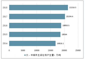 2014-2018年全國大、中城市生活垃圾產(chǎn)生量情況