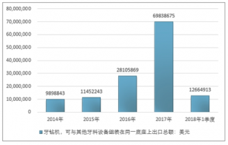 2016年我國牙鉆機(jī),可與其他牙科設(shè)備組裝在同一底座上出口總額28105869美元,2017年出口總額69838675美元;2018年1季度出口總額12664913美元。