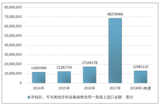 2016年我國牙鉆機(jī),可與其他牙科設(shè)備組裝在同一底座上進(jìn)口總額17144178美元,2017年進(jìn)口總額68278468美元;2018年1季度進(jìn)口總額12981110美元。