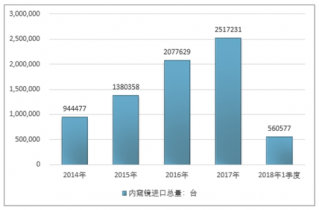 2016年我國內(nèi)窺鏡進(jìn)口總量2077629臺 ,2017年進(jìn)口總量2517231臺 ;2018年1季度進(jìn)口總量560577臺 。