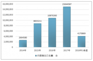2016年我國內(nèi)窺鏡出口總量10870260臺 ,2017年出口總量15044587臺 ;2018年1季度出口總量4170869臺 。