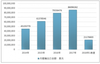 2016年我國內(nèi)窺鏡出口總額79336476美元,2017年出口總額86096262美元;2018年1季度出口總額21176603美元。