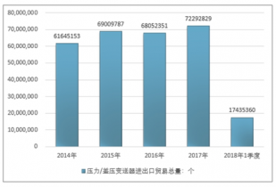 2016年我國壓力/差壓變送器進出口貿易總量68052351個 ,2017年進出口貿易總量72292829個 ;2018年1季度進出口貿易總量17435360個 。