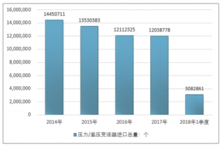 2016年我國壓力/差壓變送器進口總量12112325個 ,2017年進口總量12038778個 ;2018年1季度進口總量3082861個 。