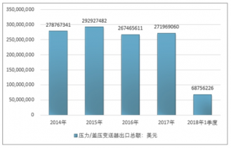 2016年我國壓力/差壓變送器出口總額267465611美元,2017年出口總額271969060美元;2018年1季度出口總額68756226美元。