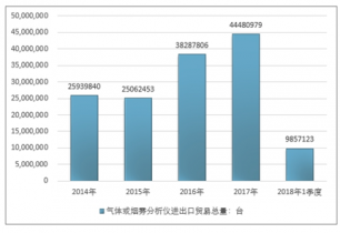 2016年我國氣體或煙霧分析儀進出口貿易總量38287806臺 ,2017年進出口貿易總量44480979臺 ;2018年1季度進出口貿易總量9857123臺 。