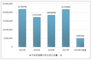 2016年我國氣體或煙霧分析儀進口總量18458698臺 ,2017年進口總量21733699臺 ;2018年1季度進口總量5005180臺 。