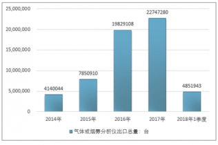 2016年我國氣體或煙霧分析儀出口總量19829108臺 ,2017年出口總量22747280臺 ;2018年1季度出口總量4851943臺 。