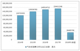 2016年我國氣體或煙霧分析儀出口總額149514712美元,2017年出口總額154411246美元;2018年1季度出口總額36485706美元。