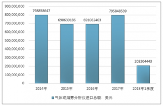 2016年我國氣體或煙霧分析儀進口總額691082463美元,2017年進口總額795848539美元;2018年1季度進口總額208204443美元。