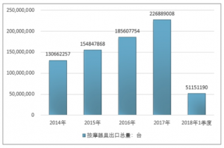2016年我國按摩器具出口總量185607754臺,2017年出口總量226889008臺;2018年1季度出口總量51151190臺。