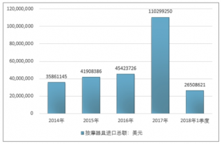2016年我國按摩器具進口總額45423726美元,2017年進口總額110299250美元;2018年1季度進口總額26508621美元。