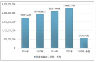 2016年我國按摩器具出口總額2110189636美元,2017年出口總額2281612885美元;2018年1季度出口總額570413880美元。
