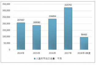 2016年我國人造關(guān)節(jié)出口總量236856千克,2017年出口總量323742千克;2018年1季度出口總量96460千克。
