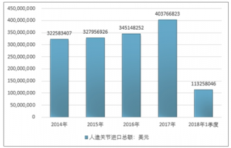 2016年我國人造關(guān)節(jié)進(jìn)口總額345148252美元,2017年進(jìn)口總額403766823美元;2018年1季度進(jìn)口總額113258046美元。