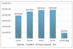2016年我國助聽器,不包括零件、附件進出口貿易總額485741617美元,2017年進出口貿易總額488016660美元;2018年1季度進出口貿易總額93647667美元。