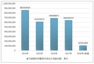 2016年我國已組裝的完整表芯進出口貿(mào)易總額690908871美元,2017年進出口貿(mào)易總額645426272美元;2018年1季度進出口貿(mào)易總額107611853美元。