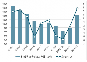 2018年1-12月中國機制紙及紙板當(dāng)月產(chǎn)量及增長走勢