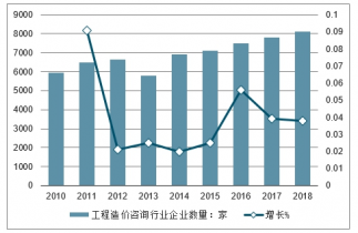 2010-2018年我國工程造價咨詢行業企業數量及增長走勢