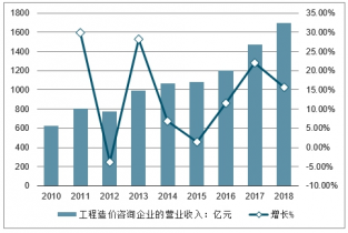 2010-2018年中國工程造價咨詢企業的營業收入及增長走勢