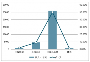 2019年中國工程勘察設計企業營業收入總計51915.2億元。其中,工程勘察收入914.8億元,占營業收入的1.8%;工程設計收入4609.2億元,占營業收入的8.9%;工程總承包收入26046.1億元,占營業收入的50.2%;其他工程咨詢業務收入657.3億元,占營業收入的1.3%。