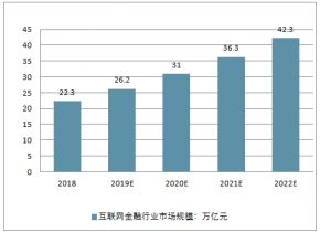 2019年我國(guó)互聯(lián)網(wǎng)金融行業(yè)市場(chǎng)規(guī)模將達(dá)到22.3萬(wàn)億元,未來(lái)五年(2018-2022)年均復(fù)合增長(zhǎng)率約為17.36%,預(yù)計(jì)到了2022年我國(guó)互聯(lián)網(wǎng)金融行業(yè)市場(chǎng)規(guī)模將達(dá)到42.3萬(wàn)億元。