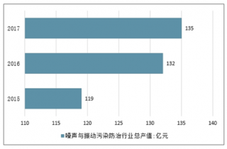 2017年全國(guó)噪聲與振動(dòng)污染防治行業(yè)總產(chǎn)值約為135億元,與上年相比略有增長(zhǎng)。其中,噪聲控制工程與裝備約71億元。