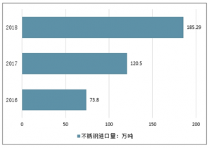 2019年進(jìn)口不銹鋼185.29萬噸,同比增加64.78萬噸,增長53.76%;