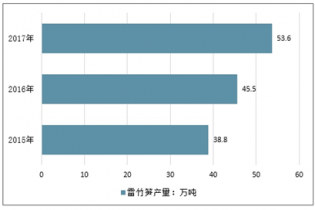 2017年我國雷竹筍產量53.6萬噸,同比2016年的45.5萬噸增長了17.8%.